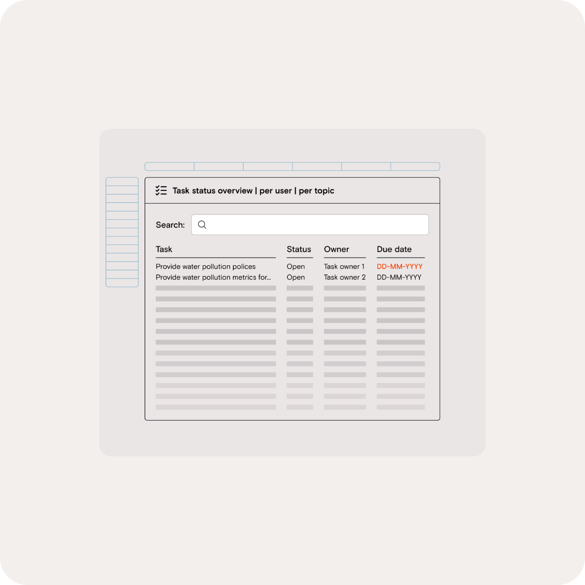 Tangelo ESG Collect gives you broad coverage across all relevant sustainability topics. Instead of managing ESG metrics through a patchwork of spreadsheets and partial solutions, you get a single, structured environment to capture, validate, and enrich both narrative and numeric data. Tasks can be assigned across teams, deadlines monitored, and progress tracked — making the entire data collection process organized and auditable.