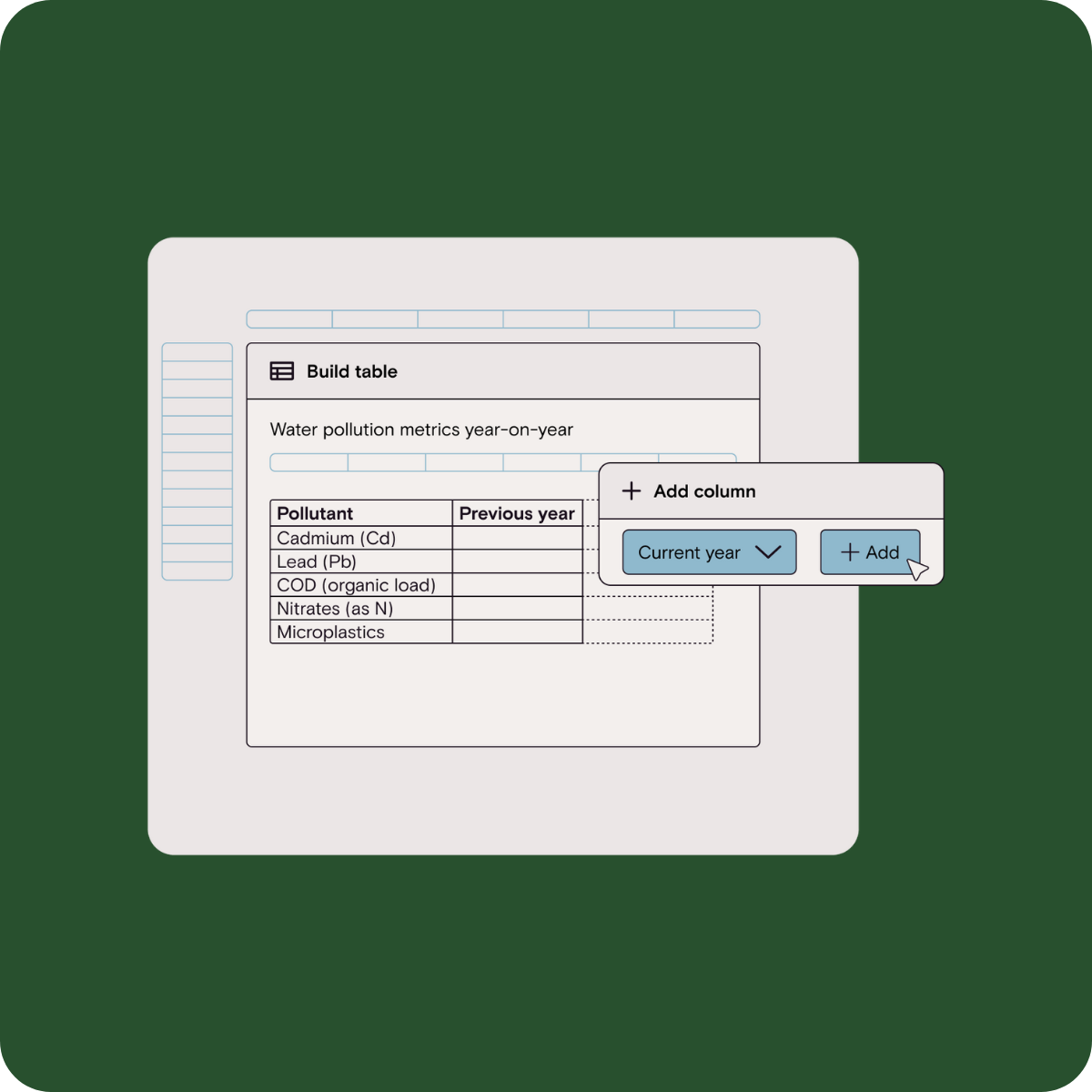 Turn collected data into disclosure tables ready for both internal and external reporting. The guided builder applies the correct framework logic, dimensions, and reporting periods, with taxonomy links for automated tagging and audit trail data included by default when content flows into Tangelo.