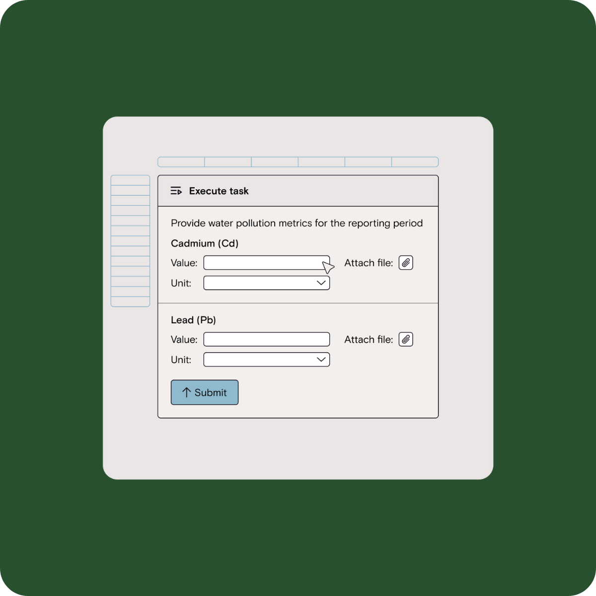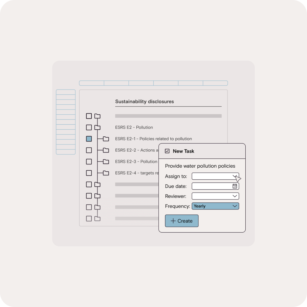 Transform scoped disclosures into a structured data collection plan. Define and group tasks, assign contributors, and set timelines — with flexibility to determine data granularity and carry content forward between reporting periods.