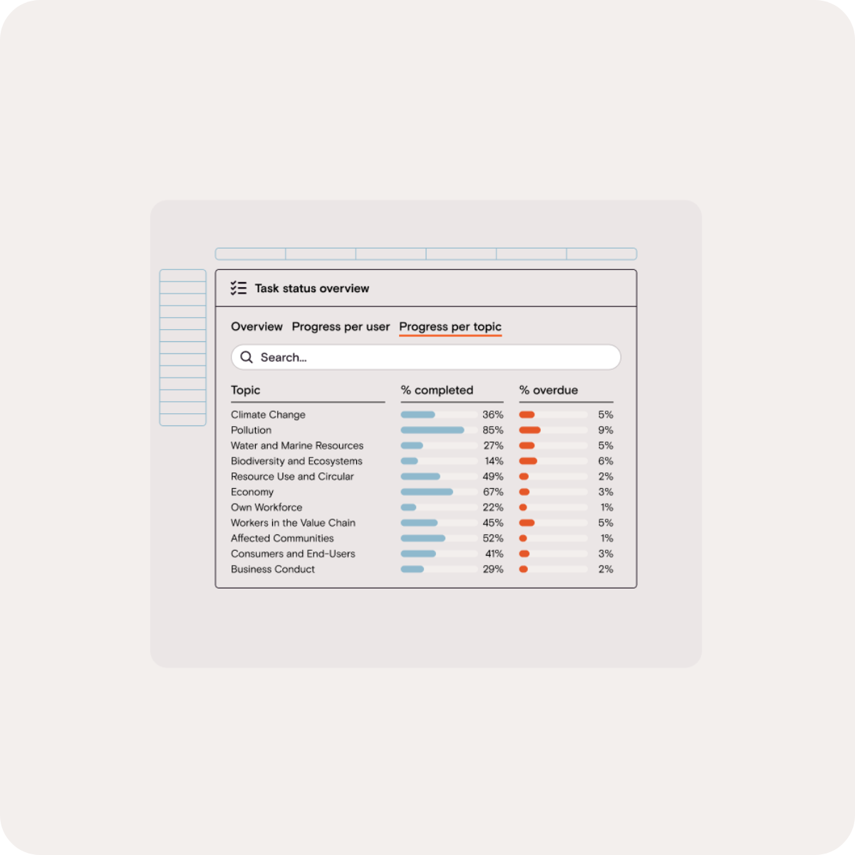 Stay in control of your ESG data collection process. Monitor task progress in real time, send automated reminders, and oversee reviews and sign-offs — while also tracking ESG performance across key topics and targets.