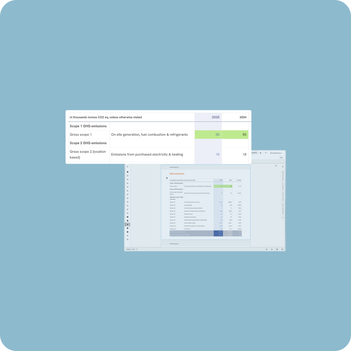 Sync tables, charts, and figures with financial, HR, and ESG systems. Keep your numbers accurate and up to date without manual updates.